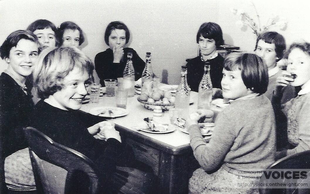 Front of stage, Mrs. Hans Hamilton, writer and producer, with Sam McDonald who provided music and drums.