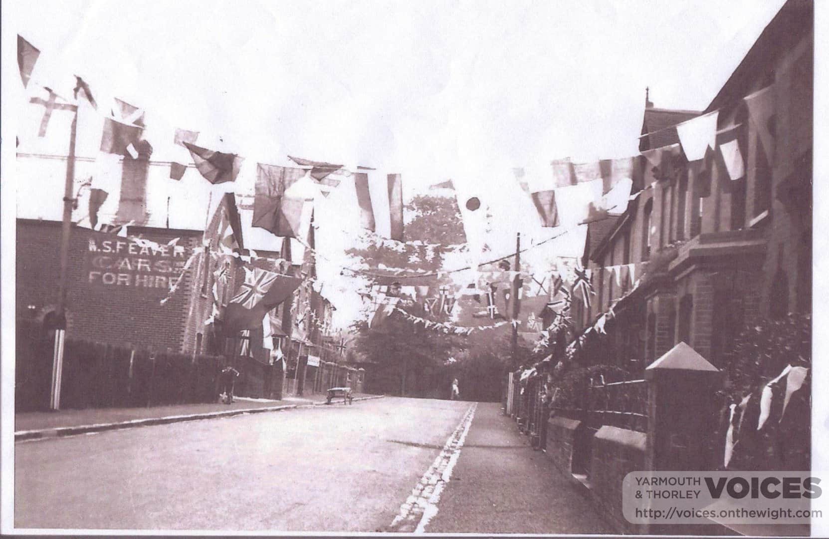 An aerial view of Yarmouth, showing two huts and the old Norton Ferry shelter on Sandhard, the Bridge House and big area of the harbour dried out at low tide, Thorley can be seen in the background.
