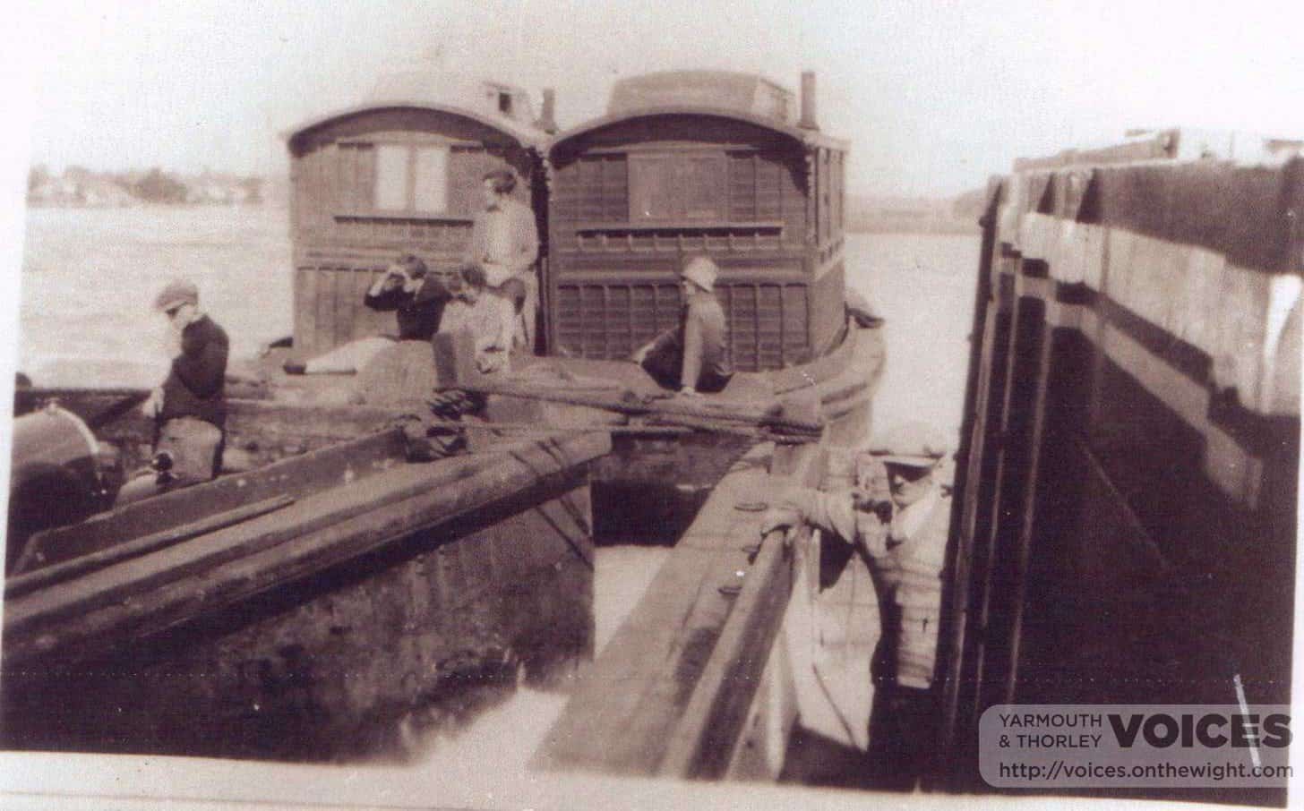 The Fair is coming to the Island on tow boats as they were known, towed by the tug boat “Jumsey” the tow boats were sometimes called Jumseys. The background shows the period caravans used by the fair families at that time.